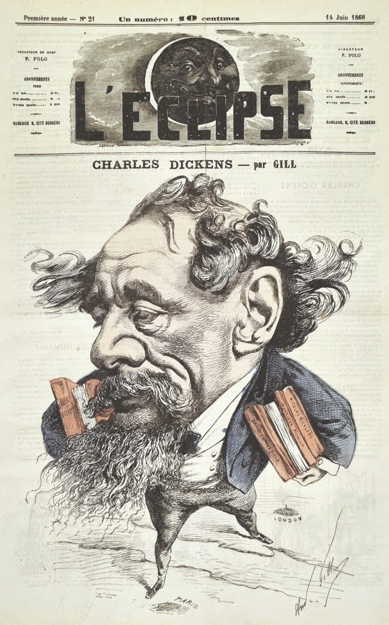 This print, showing Charles Dickens crossing the Channel with his left leg near London and the other towards Paris, hints to his famed 1859 publication A Tale of Two Cities.