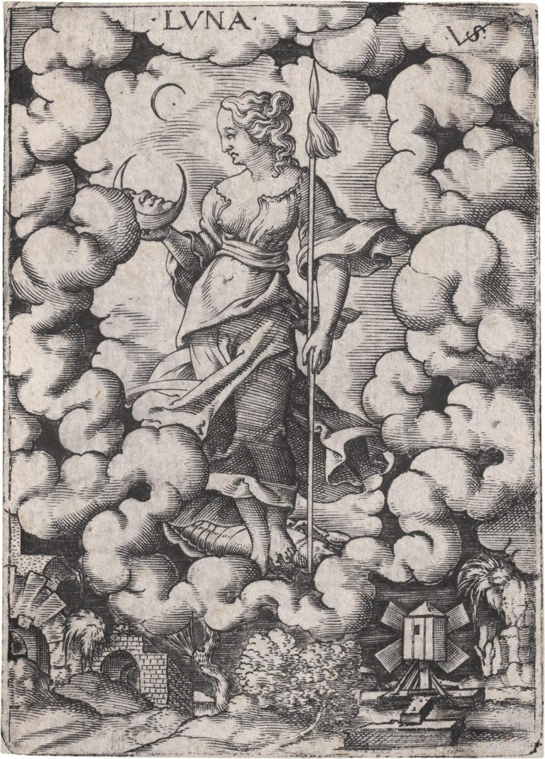 Allegorical depiction of the Moon. The entire series, preserved by Art Depot Olieslagers, follows the Ptolomaic geocentric model, including Saturnus, Jupiter, Mars, Sol, Venus and Mercurius, respectively O'Dell-Franke Solis e29-34.