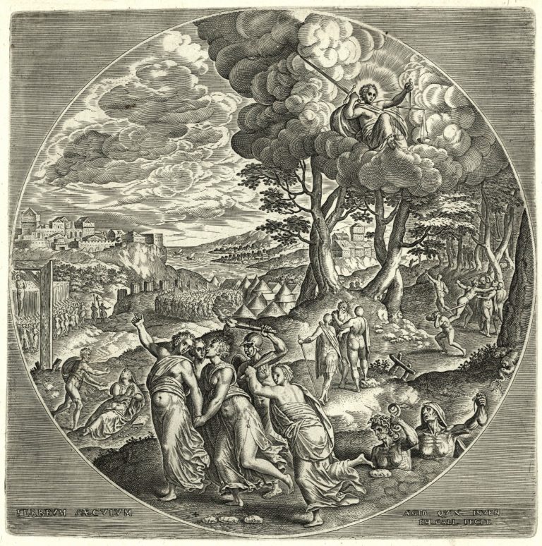 Engraved after a design from Raphael Sanzio's atelier. Agostino Veneziano worked closely with Raphael and his team, who were stationed at the Palatium Vaticanum in Civitas Leonina, nowadays known as the Apostolic Palace in Vatican City. From 1516 onwards and through Marcantonio Raimondi's workshop, Veneziano produced engravings of exceptional quality, which genuinely reflected Raphael's aesthetic.