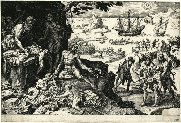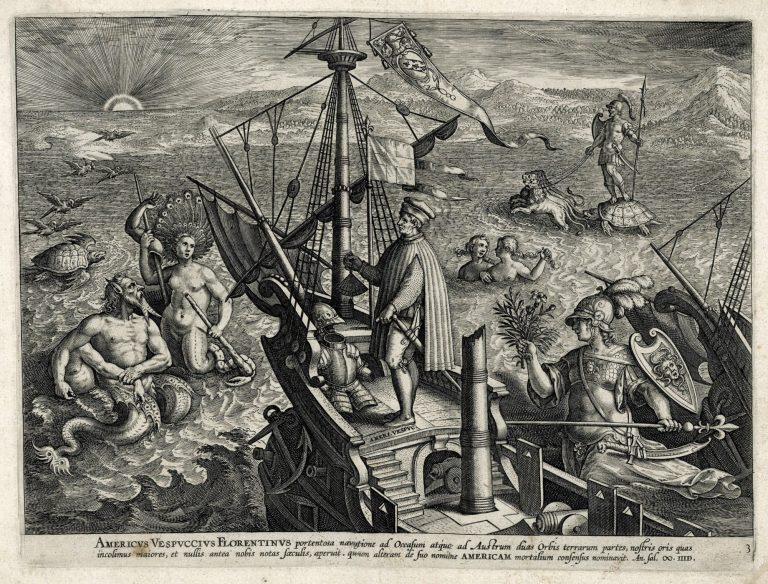 A richly toned impression of the 3rd plate out of 4 in the America Retectio series. This set of 3 works, plus a title page, celebrates the efforts of Columbus, Vespucci and Magellan in the discovery of the 'New World'.