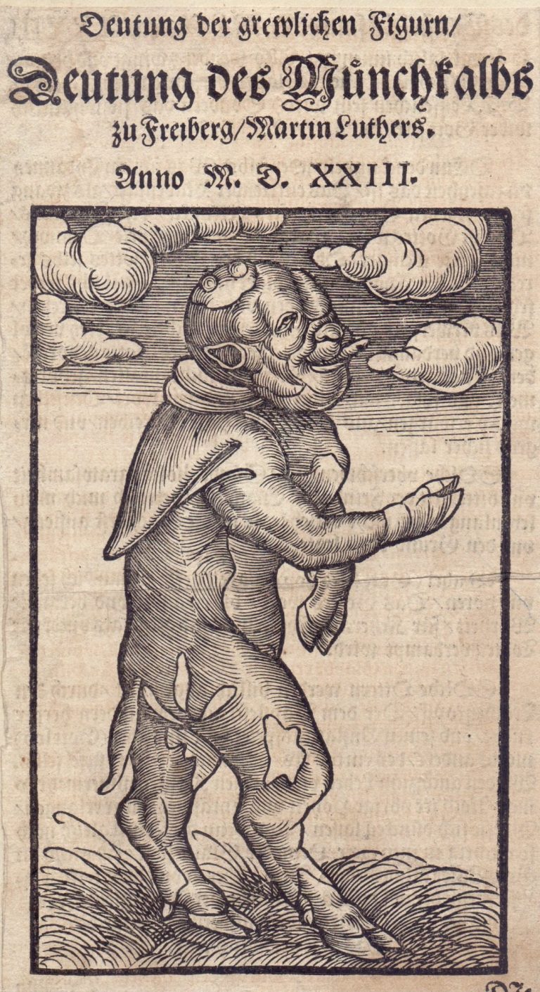 Woodcut of the Monk's Calf (Mönchskalb) from Freiburg in the anti-papal pamphlet (Flugschrift gegen das Papstregiment und die Auswuchse nahenden Unheils) by Martin Luther. Published together with the Papal Ass (Bapstesel) from Rome, presenting both gruesome figures (Deutung der grewlichen Figurn), which Luther and his secondant Philip Melanchton applied to satirically illustrate the sins of the Catholic church. Deformations at birth were considered admonitions of God appealing for repentance, as a preamble to the forthcoming and inevitable catastrophic fate of the world.