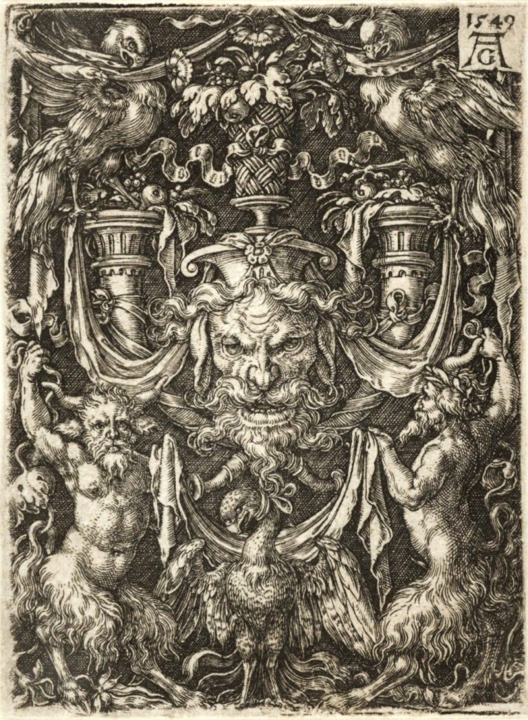 Ornamental design with a mask and an eagle between two fauns below