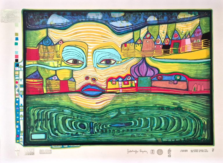 This serigraph tells the story of Hundertwasser's escapades in the Southern part of Eastern Europe, involving his relations with a Bulgarian actress.