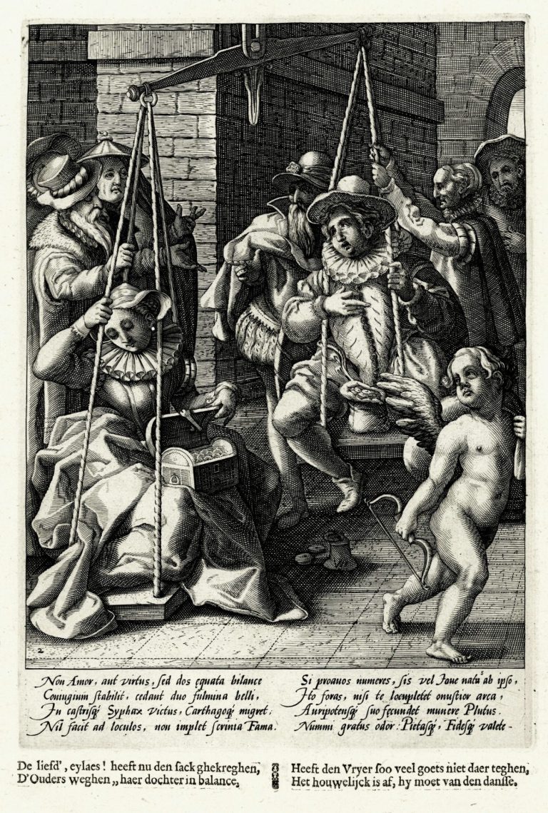 The two most pervasive incentives in life, love and capital, imbalanced. This strong imagery shows Cupid abandoning the couple as the man’s parents struggle and fail to balance the scales of marriage, because their funds do not match those of the prospective in-laws.