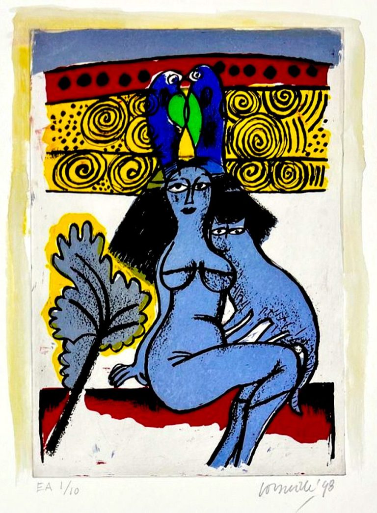 This aquatint, 1 of 10, was embellished by Corneille with a cartouche of cream and yellowish gouache. The other 9 artist proofs were treated and/or coloured differently, rendering this "multiple" a unique work. Verso retains the artist's stamp.