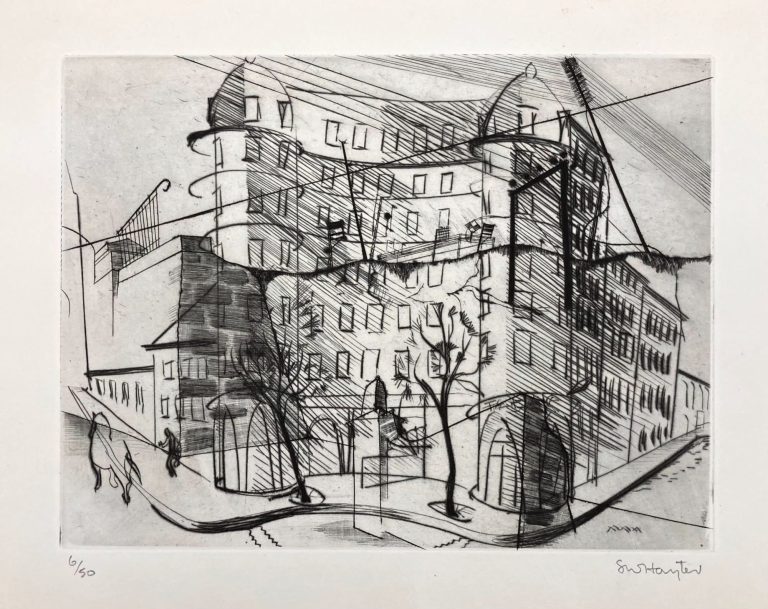 Paysages Urbains is Stanley William Hayter's first ever portfolio of 6 plates depicting sites around Paris in a surrealist manner. These etchings with plate tone and drypoint were created in the very early years of his famed Atelier 17, which served as the fundamental location in the development of engraving skills for many other European greats like Joan Miró, Max Ernst, Maria Helena Vieira da Silva and Alberto Giacometti.